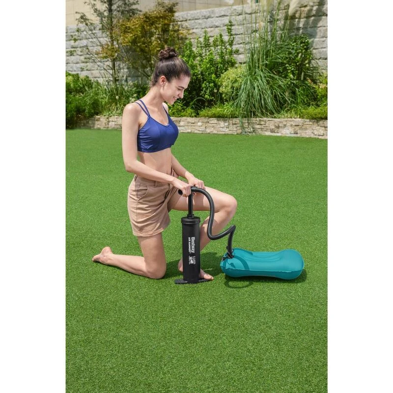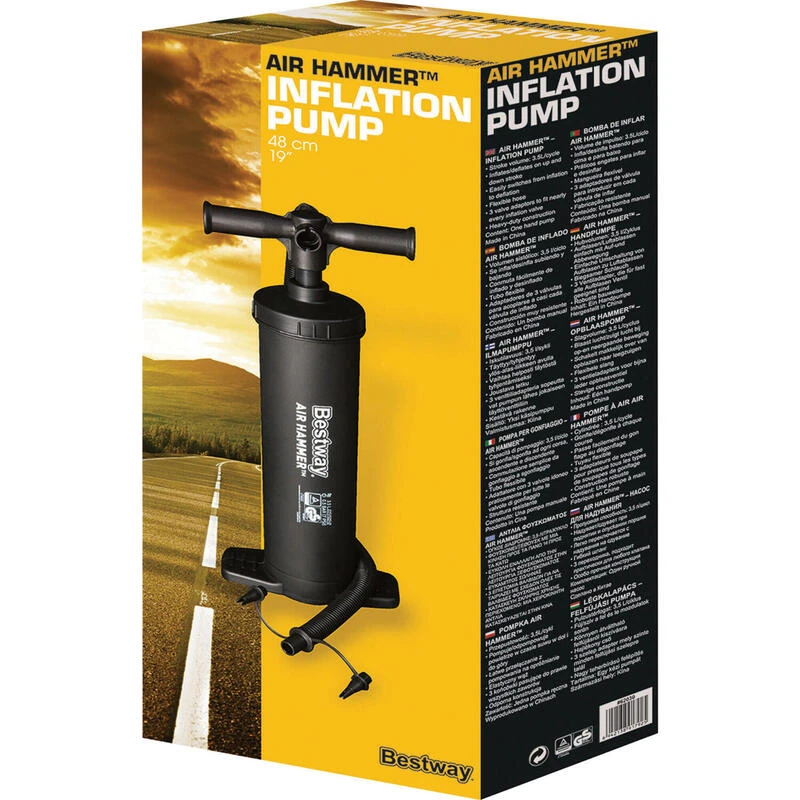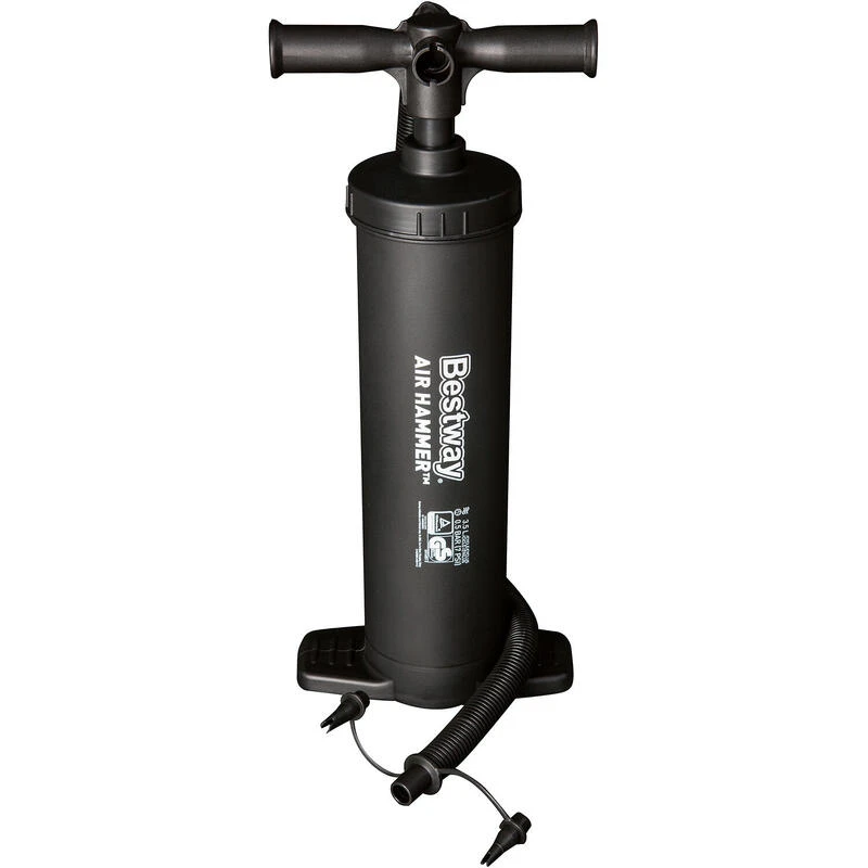 * Pompe à air à main * 3 bouchons de valve * Inclut le tuyau flexible * Fonction de dégonflage * Volume de course 3.5 litres