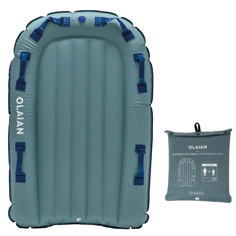 Conçu pour un adulte et un enfant (total 120kg) pour partager des vagues et vivre ses premières sensations de glisse. Eau jusqu’au nombril maximum. Vagues <1m.Bodyboard tandem compact pour initier les enfants au plaisir de glisser sur une vague. Nouvelle matière plus résistante.