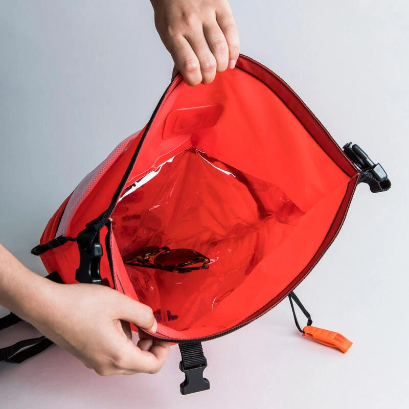 Pour nager en eau libre, il est fortement recommandé d’utiliser une bouée pour être repéré pas les bateaux et les secouristes. La bouée sert également de base de repos lorsque le nageur est fatigué ou a des crampes. Un sifflet est accroché à la bouée pour vous permettre de signaler votre présence de manière auditive, si nécessaire.