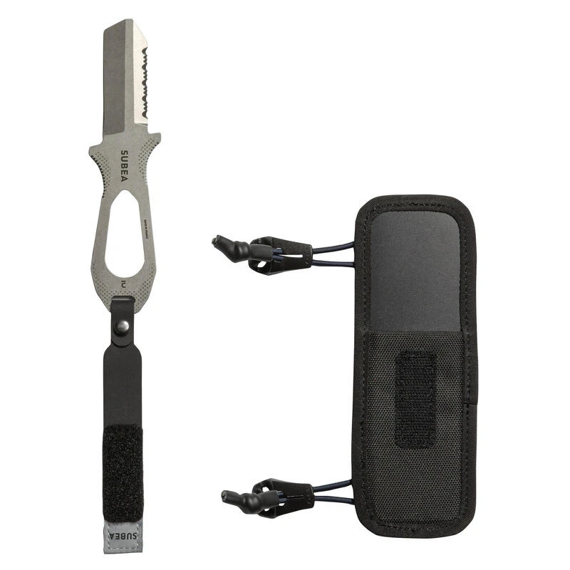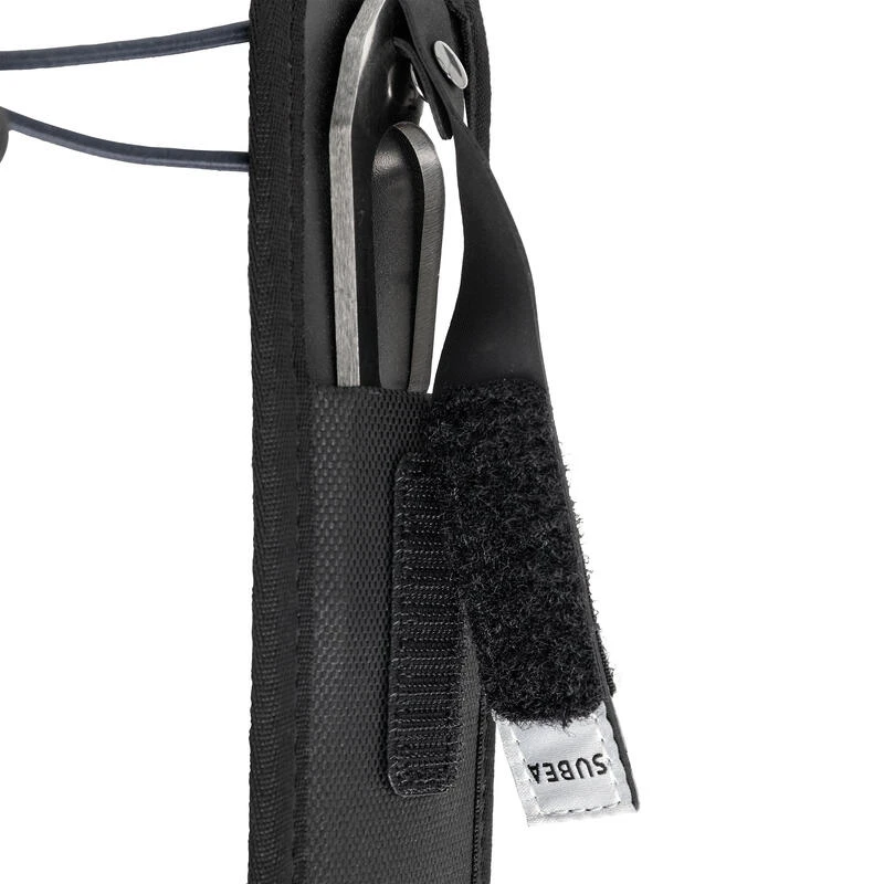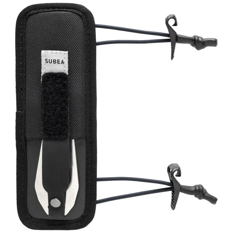 Les sangles élastiques permettent d’éviter au couteau de bouger et de tourner sur le plongeur. Nous préconisions une fixation du fourreau sur le tuyau annelé de l’inflateur, tête en bas afin de le sortir et de le ranger même à une main. Grace à son large passant vous avez également la possibilité de le fixer ailleurs sur votre équipement. La fermeture des sangles s’effectue avec des clips en matière plastique robuste.