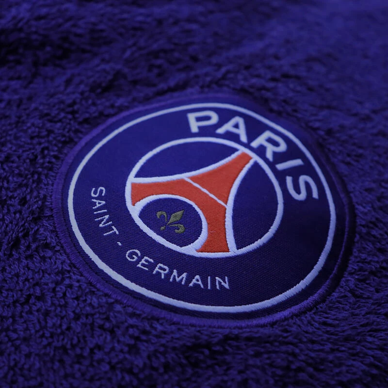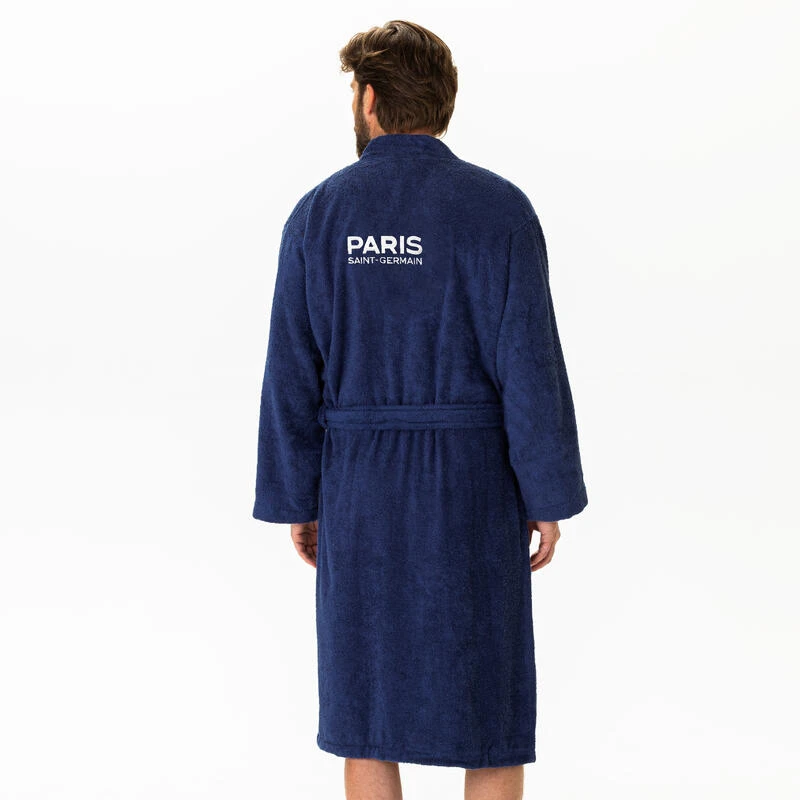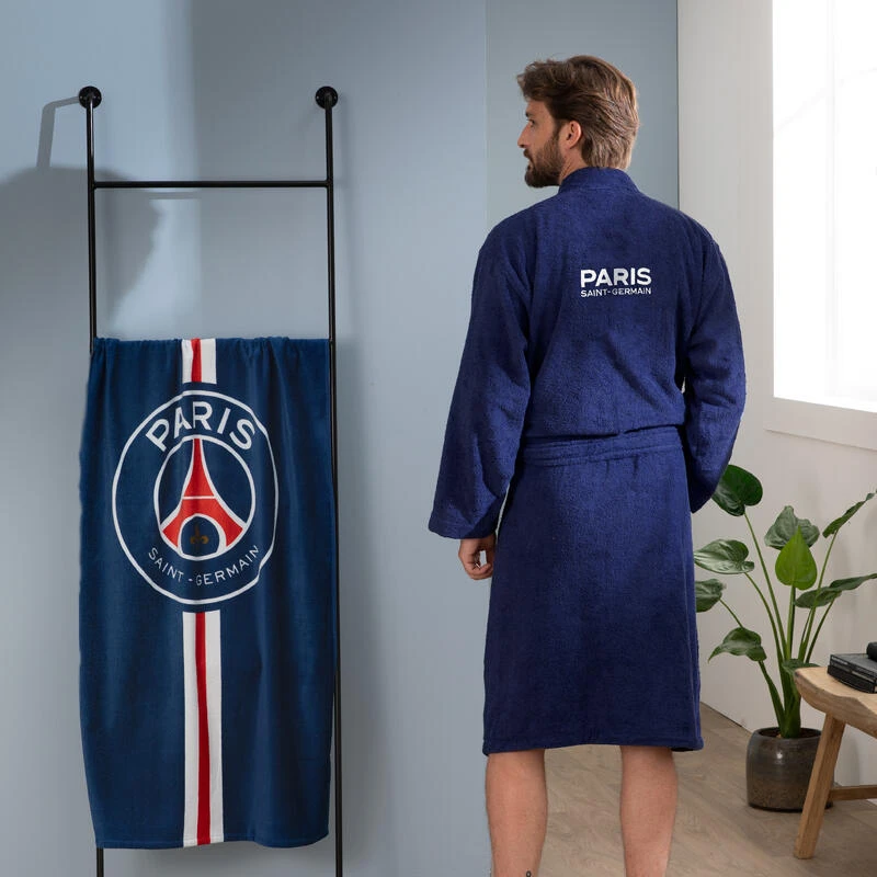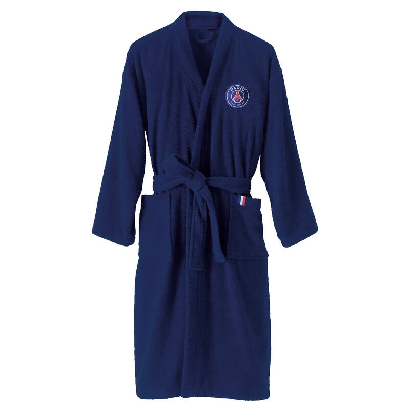 Peignoir à poches et col kimono, logo PSG brodé pour les fans de Paris et Mbappé. Confortable et respirant grâce au coton en micro-bouclette garantissant une absorption parfaite.