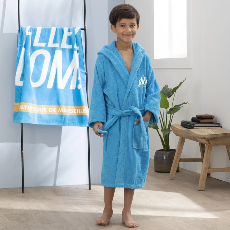 Peignoir à capuche pour enfant, logo OM brodé pour les plus grands fans du club de foot de Marseille. Confortable et respirant grâce au coton en micro-bouclette garantissant une absorption parfaite.