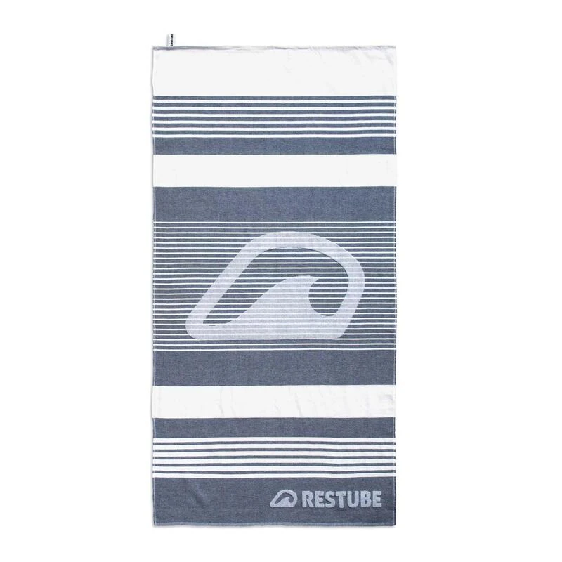 La serviette de plage en bleu subtil de RESTUBE est parfaite pour votre journée au bord de l’eau.